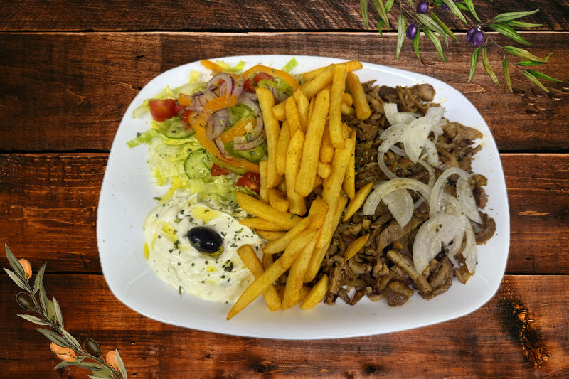 Unser Gyros ist hausgemacht und wird nach einem alten Familienrezept sorgfältig mariniert. Um höchste Frische und beste Qualität zu garantieren, bereiten wir unseren Gyros ausschließlich am Wochenende zu. Langsam am Drehspieß gegrillt, bleibt das Fleisch besonders saftig und aromatisch. Serviert mit knusprigen Pommes frites, frischem Salat und cremigem Tzatziki – ein echter griechischer Klassiker mit Liebe zubereitet.